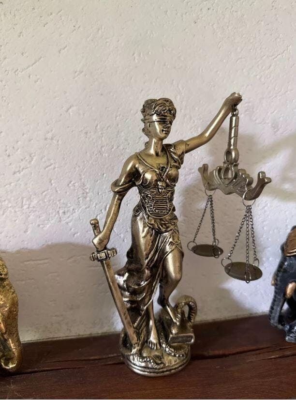 Symbolisme puissant : La statue présente Thémis, les yeux bandés, tenant une balance dans une main et une épée dans l'autre, tout en écrasant un serpent sous ses pieds. Chaque élément est chargé de signification : le bandeau symbolise l'impartialité, la balance représente l'équité, l'épée la force de la justice, et le serpent à ses pieds incarne la victoire sur le mal. Le livre sous son pied représente la loi et la constitution, les fondements mêmes de la justice.